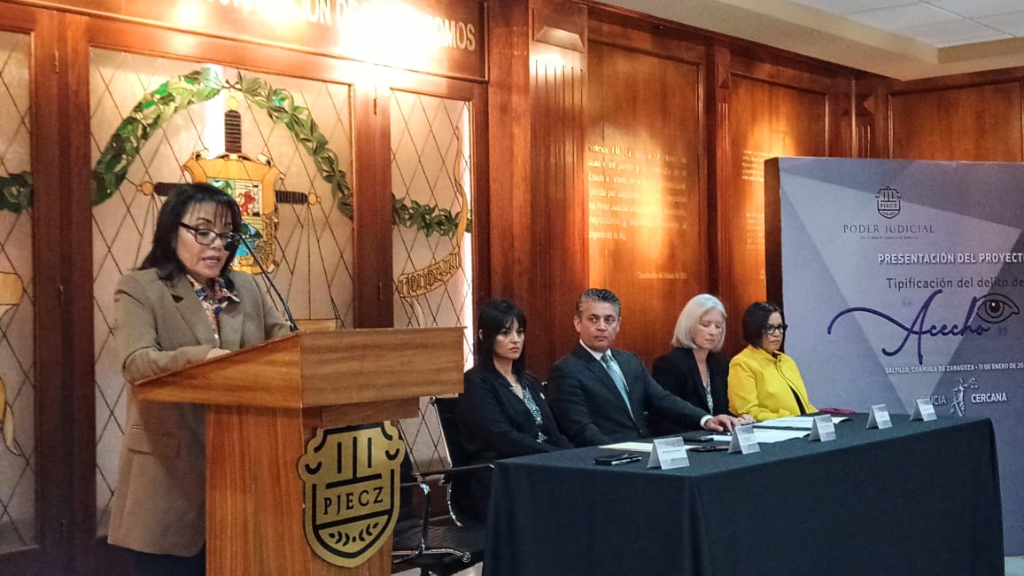 En un esfuerzo conjunto entre el Congreso y Poder Judicial de Coahuila, este miércoles, desde el Palacio de Justicia en Saltillo, se presentó el proyecto para tipificar el delito de acecho en el Código Penal de Coahuila, a fin de sancionar a quienes lo cometan con sentencias de entre seis meses y cuatro años de prisión o multa económica, dependiendo de la gravedad de los casos.