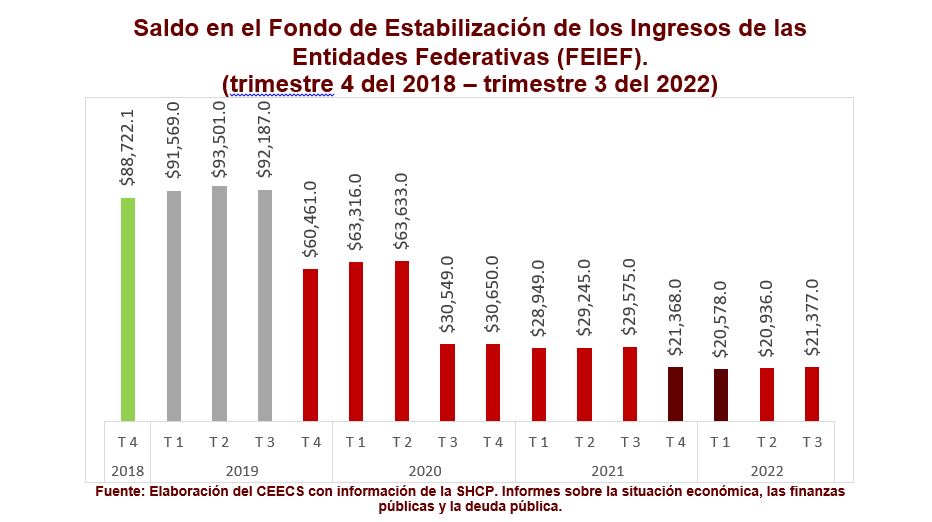 Por su parte, el Fondo de Estabilización de los Ingresos de las entidades Federativas (FEIEF), el cual tiene como finalidad subsanar la disminución de las Participaciones Federales derivadas de modificaciones en la recaudación Federal participable para que los Estados conserven un nivel mínimo de ingresos y mantengan en armonía sus finanzas, en el último trimestre del 2018 ascendía a $88,722.1 millones de pesos, pero, en el transcurso de esta administración el Gobierno Federal ha utilizado esos recursos, de manera que para el tercer trimestre del 2022 el saldo de este fue de $21,377.0 millones de pesos exhibiendo una baja del 75.9%, es decir, una disminución de $67,345.1 millones de pesos.