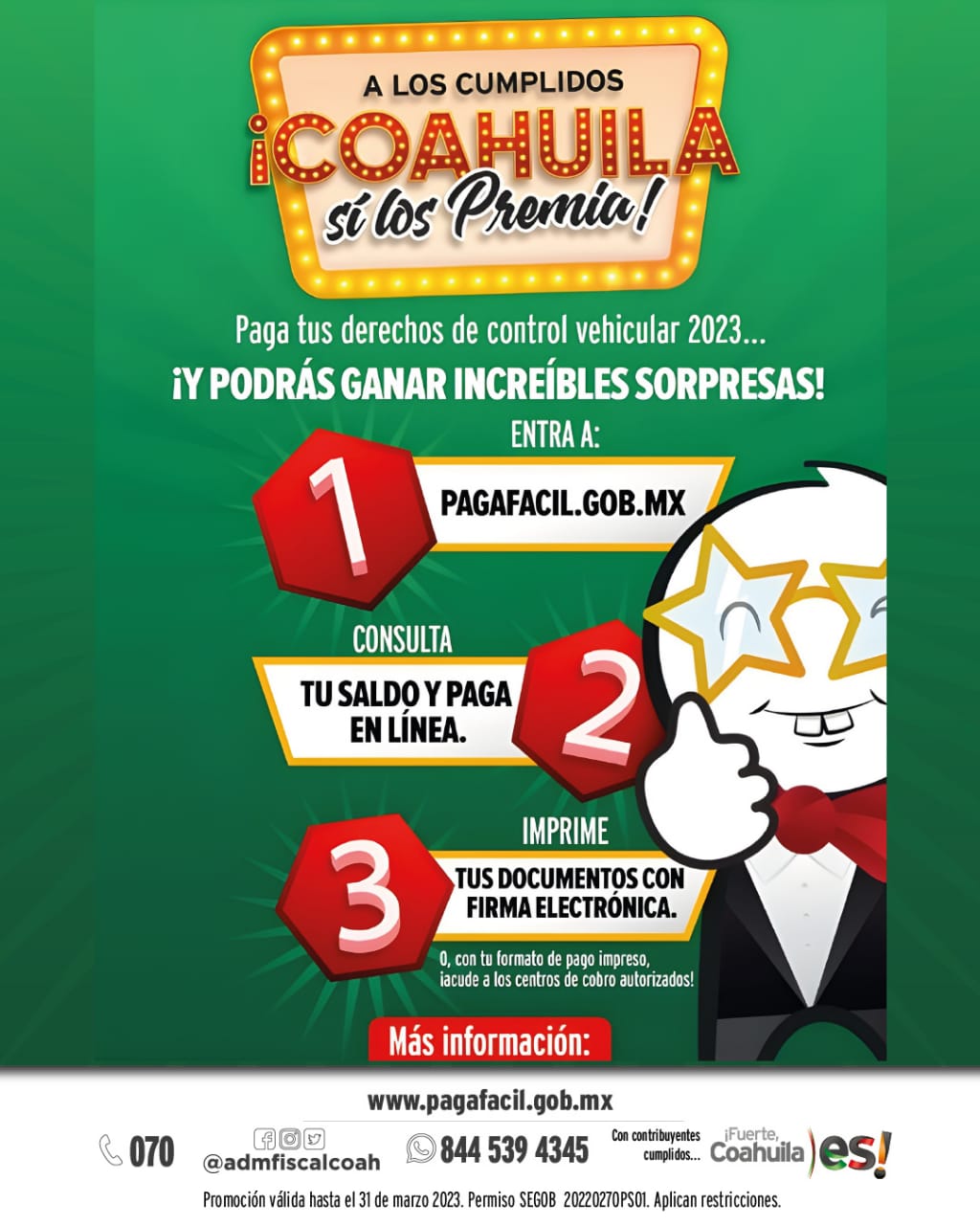 Cubre tu control vehicular 2023 antes del 31 de marzo del presente año y participa automáticamente en el sorteo “A los cumplidos Coahuila sí los premia”.