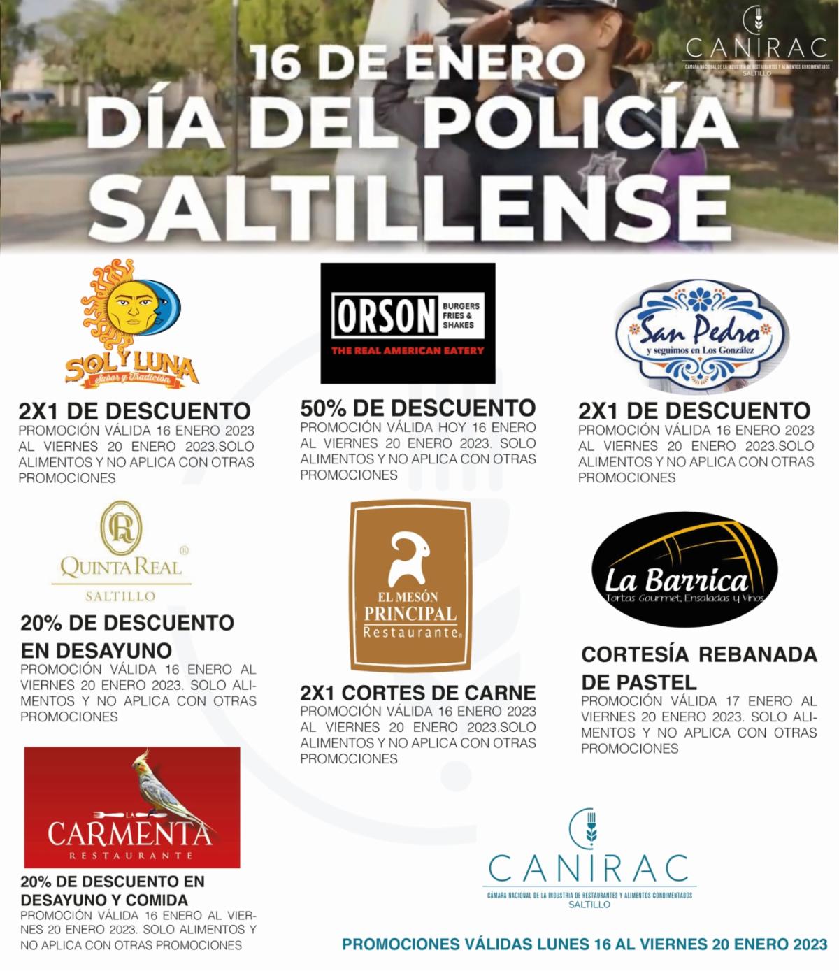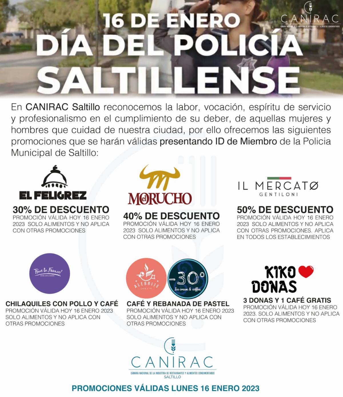 La Cámara Nacional de la Industria de Restaurantes y Alimentos Condimentados, CANIRAC Saltillo, se sumó al festejo por el Día del Policía Saltillense con promociones para elementos de la Comisaría de Seguridad y Protección Ciudadana.