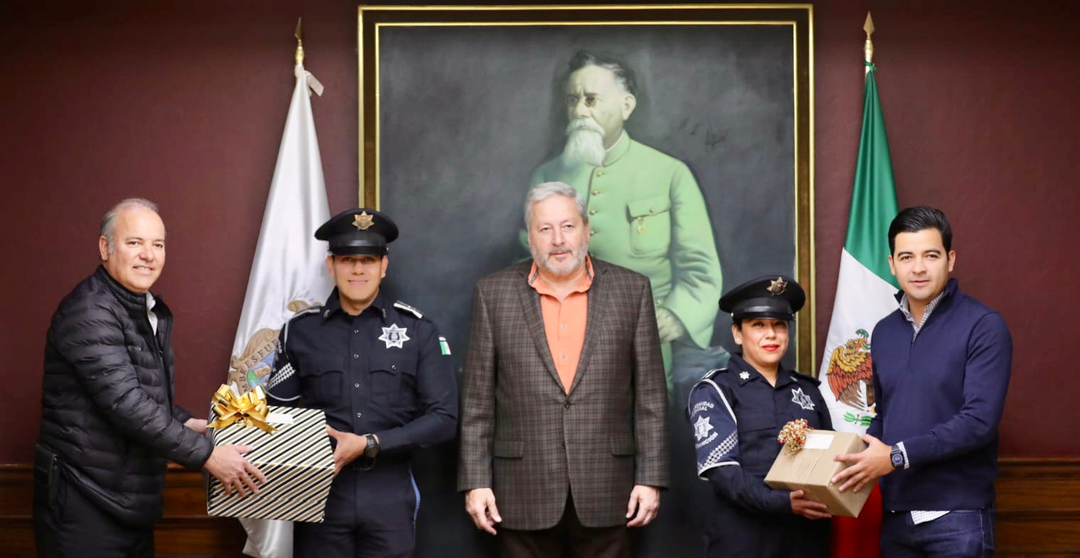 En un acto que encabezó el alcalde José María Fraustro Siller, el presidente de la Cámara Nacional de Comercio, Canaco, Alejandro Pepi de la Peña; y el presidente de la Cámara Nacional de la Industria de Restaurantes y Alimentos Condimentados, Canirac, Eder López González, entregaron presentes a policías municipales.