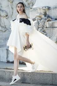 La actriz y modelo estadounidense Olivia Palermo combina en la foto que vemos debajo, un vestido blanco con vuelo en cola con unos tenis blancos que tiene detalles de pedrería. El clutch y el collar recuerdan las inserciones de joyas de los zapatos.