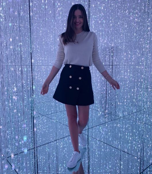 La supermodelo Miranda Kerr con una minifalda cruzada azul marino adornada con botones dorados, un top de seda con cuello redondo y, en lugar de las sandalias más obvias o los botines de tacón, un par de tenis blancos. Como supermodelo, Kerr ciertamente recordamos que no necesitas usar tacones para verte con el mejor estilo.