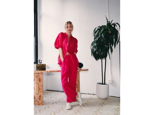 La supermodelo estadounidense Martha Hunt usa un conjunto de camisa y pantalón de seda violeta con tenis deportivos blancos. Un par de zapatos de tacón o sandalias de tacón habrían hecho el atuendo más sofisticado, mientras que Hunt lo minimizó perfectamente con tenis de deporte. ¿El toque súper sexy? El sostén visible que se asoma desde la camisa desabrochada.
