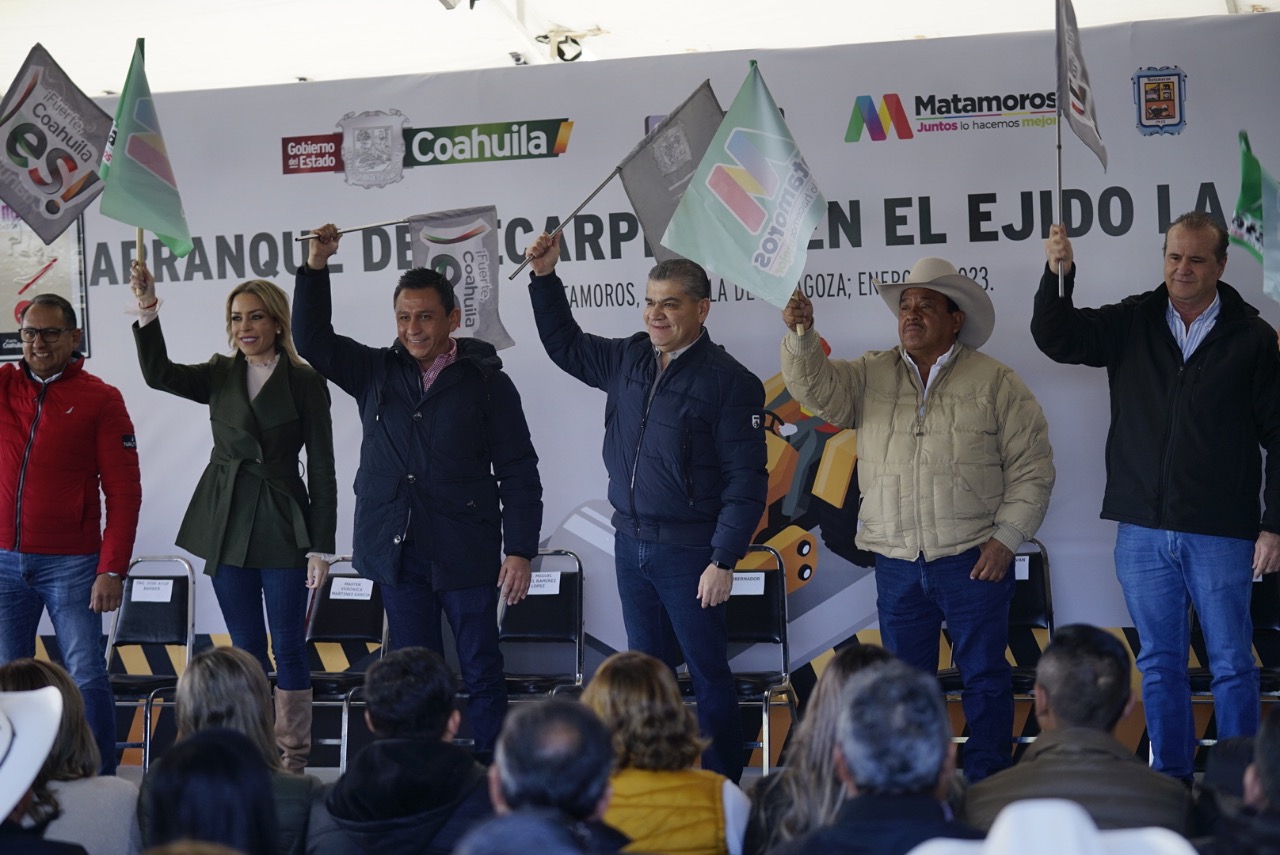 Matamoros, Coahuila de Zaragoza.- El gobernador Miguel Ángel Riquelme Solís, junto al alcalde Miguel Ángel Ramírez López, dieron el banderazo de arranque de recarpeteo en el Ejido La Purísima, en este municipio, donde la inversión será de 4.5 millones de pesos.