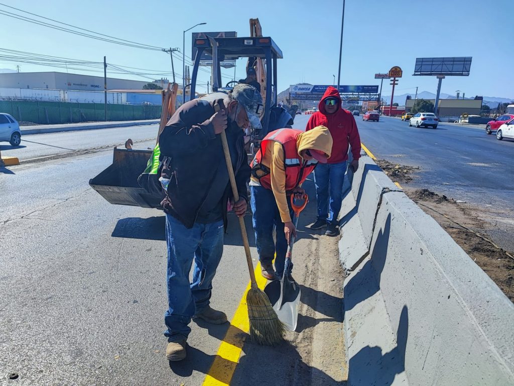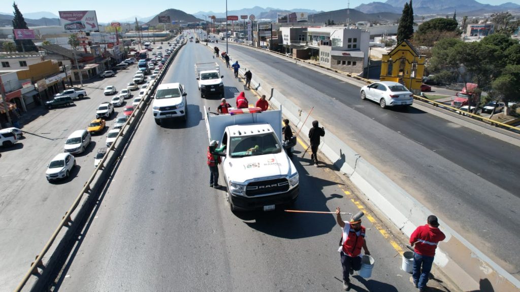 “Estamos trabajando en jornadas parciales de nueve de la mañana al mediodía, conforme nos lo permite el tráfico vehicular. Traemos una limpieza profunda en los laterales y en todo el camellón central, también alineamos ballenas, se está colocando la pintura en puente y asfalto para que esté visible al automovilista”, explicó César Flores Jiménez, director de Servicios Municipales.