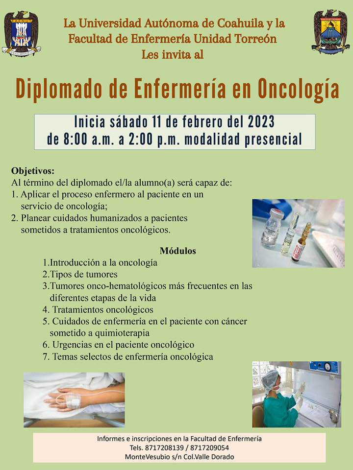 Torreón, Coahuila.- La Universidad Autónoma de Coahuila a través de la Facultad de Enfermería Unidad Torreón, invita a cursar el Diplomado de Enfermería en Oncología, el cual iniciará el sábado 11 de febrero del 2023 en las instalaciones del plantel, en un horario de 8:00 a 14:00 horas.