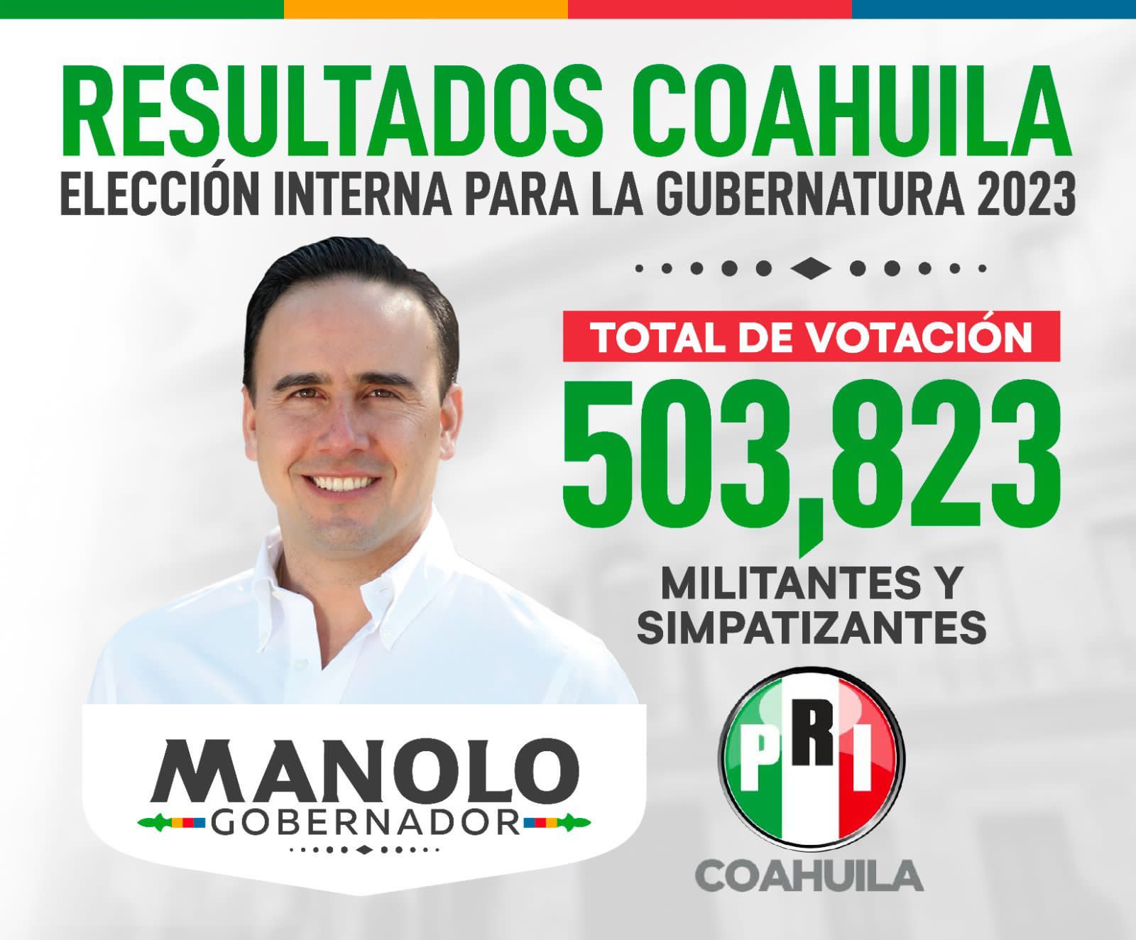 En el cierre del proceso del PRI Coahuila para la definición de su candidato, en una jornada sin precedente se registró la participación de 503 mil 823 ciudadanos en las urnas, que apoyaron la candidatura de Manolo Jiménez a la gubernatura de Coahuila.