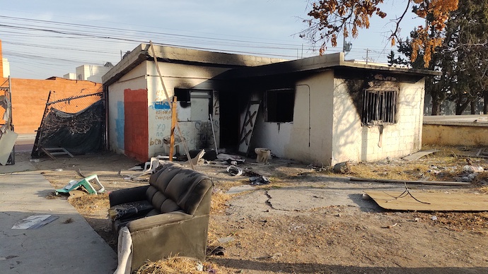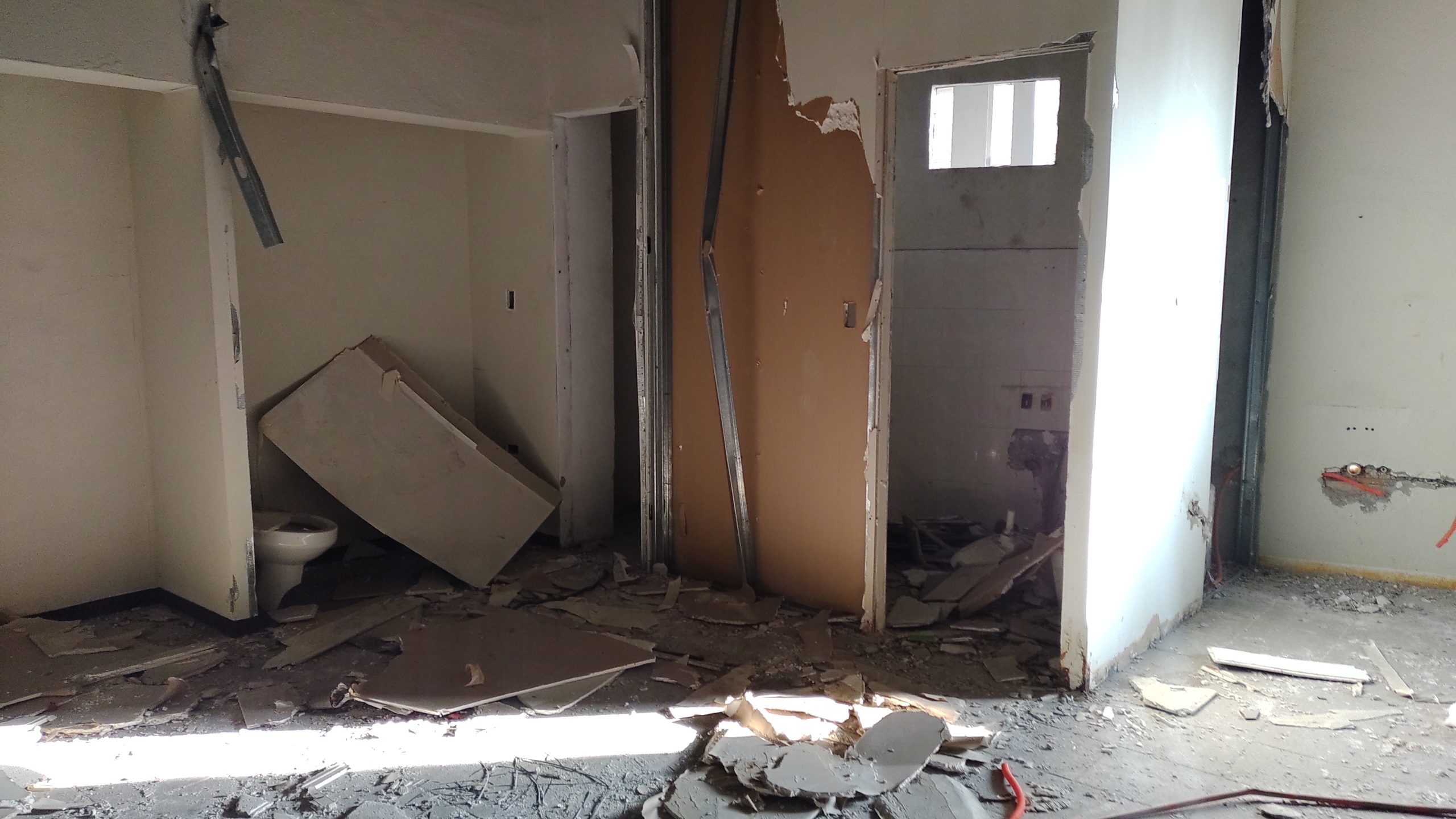 Ya al ingresar al albergue en sí, ningún muro de tablaroca se salvó de ser derribado y hecho pedazos, por lo que tiene que caminar entre los escombros de lo que antes eran muros de oficinas, estancias de internos y de vigilantes.