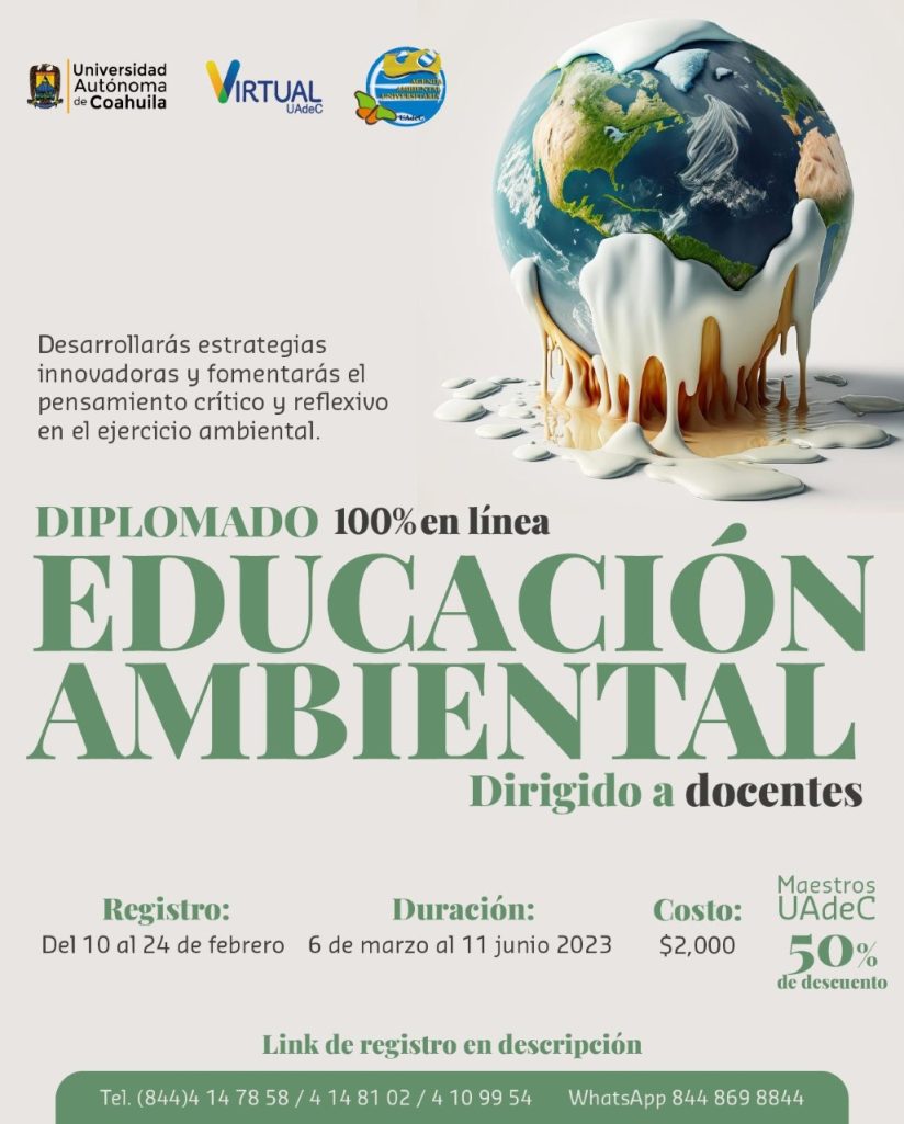 La Universidad Autónoma de Coahuila, a través de la Agenda Ambiental Universitaria y la Coordinación General de Educación a Distancia, convoca a docentes a cursar el Diplomado en Educación Ambiental en Línea, que se desarrollará del 6 de marzo al 11 de junio de 2023.