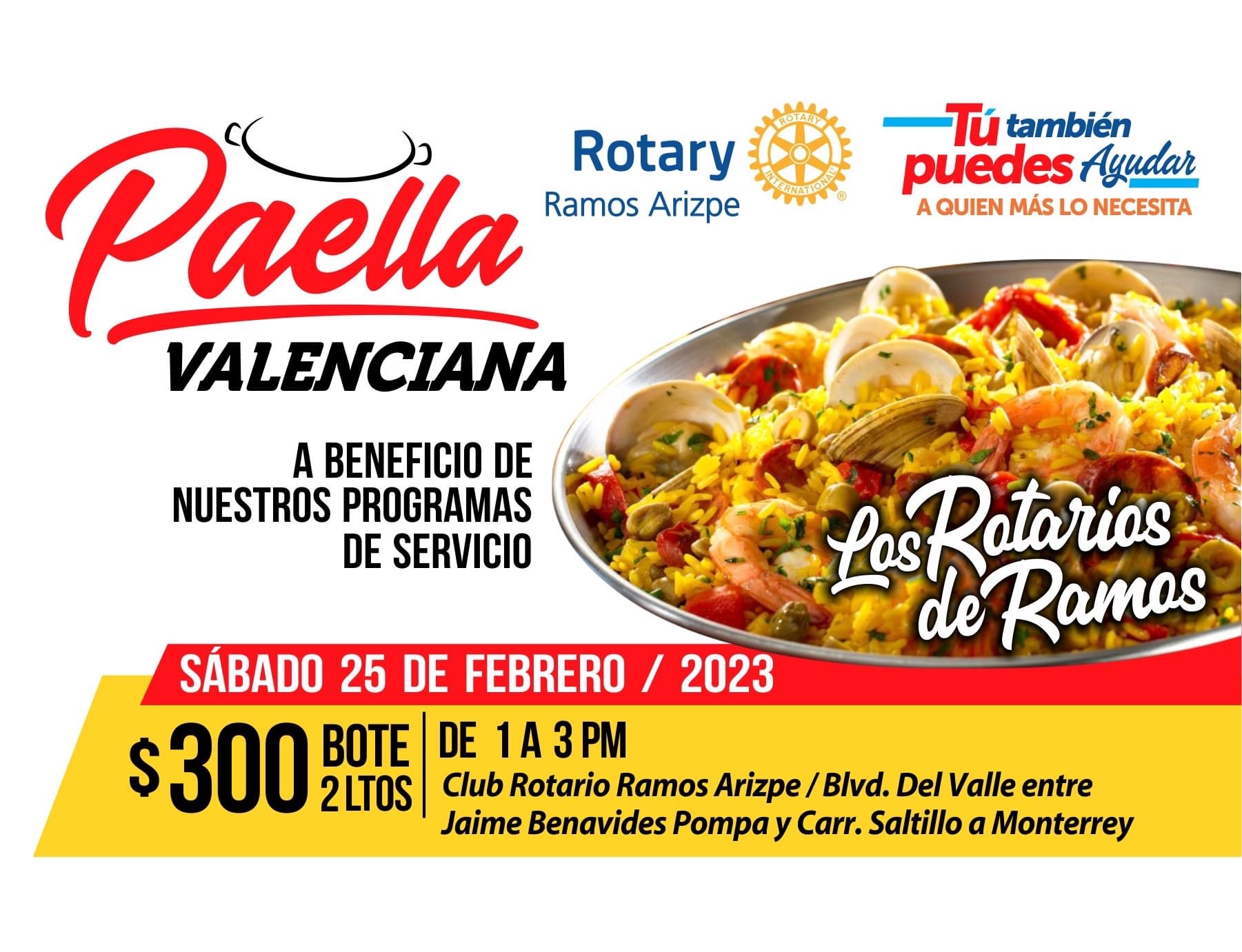 Para beneficiar a los Centros de Atención Múltiple (CAM) 11 y 38, al Centro de Rehabilitación ‘Esperanza y Nueva Vida’, dar mantenimiento al albergue campesino ‘Aurelia Delgado de Sandoval’ así como la ejecución de distintas acciones sin fines de lucro, el Club Rotario de Ramos Arizpe realizará este próximo sábado 25 de febrero a partir de las 13:00 horas su tradicional venta de paella a la valenciana.