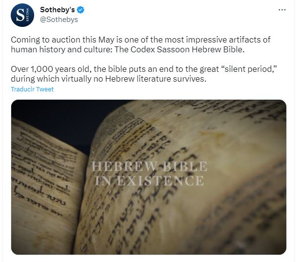 Nueva York, Estados Unidos.- La Biblia hebrea más antigua y completa del mundo, un ejemplar único e históricamente muy valioso, el próximo mayo será subastado en Nueva York por la casa de subastas Sotheby´s por un valor que se estima rondará los 50 millones de dólares. Anunció el pasado 15 de febrero la casa de subastas Sotheby´s.