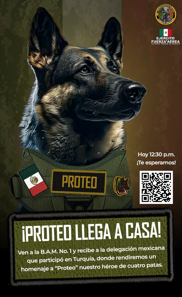 La cita para el homenaje a Proteo es a las 12:30 horas de este 16 de febrero en la Base Aérea Militar Número 1, en Santa Lucía, en el Estado de México; en la cual cuerpo de Proteo llegará a nuestro país junto con la delegación mexicana que participó en las labores de búsqueda y rescate en Turquía, quienes acompañarán al can en su último adiós.