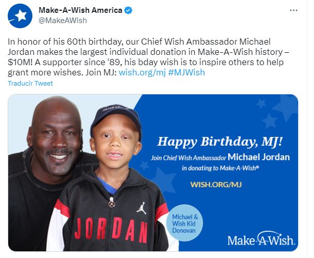 In honor of his 60th birthday, our Chief Wish Ambassador Michael Jordan makes the largest individual donation in Make-A-Wish history – $10M! A supporter since ’89, his bday wish is to inspire others to help grant more wishes. Join MJ: https://t.co/xRMm3MktP0 #MJWish pic.twitter.com/PEG0hS9jur