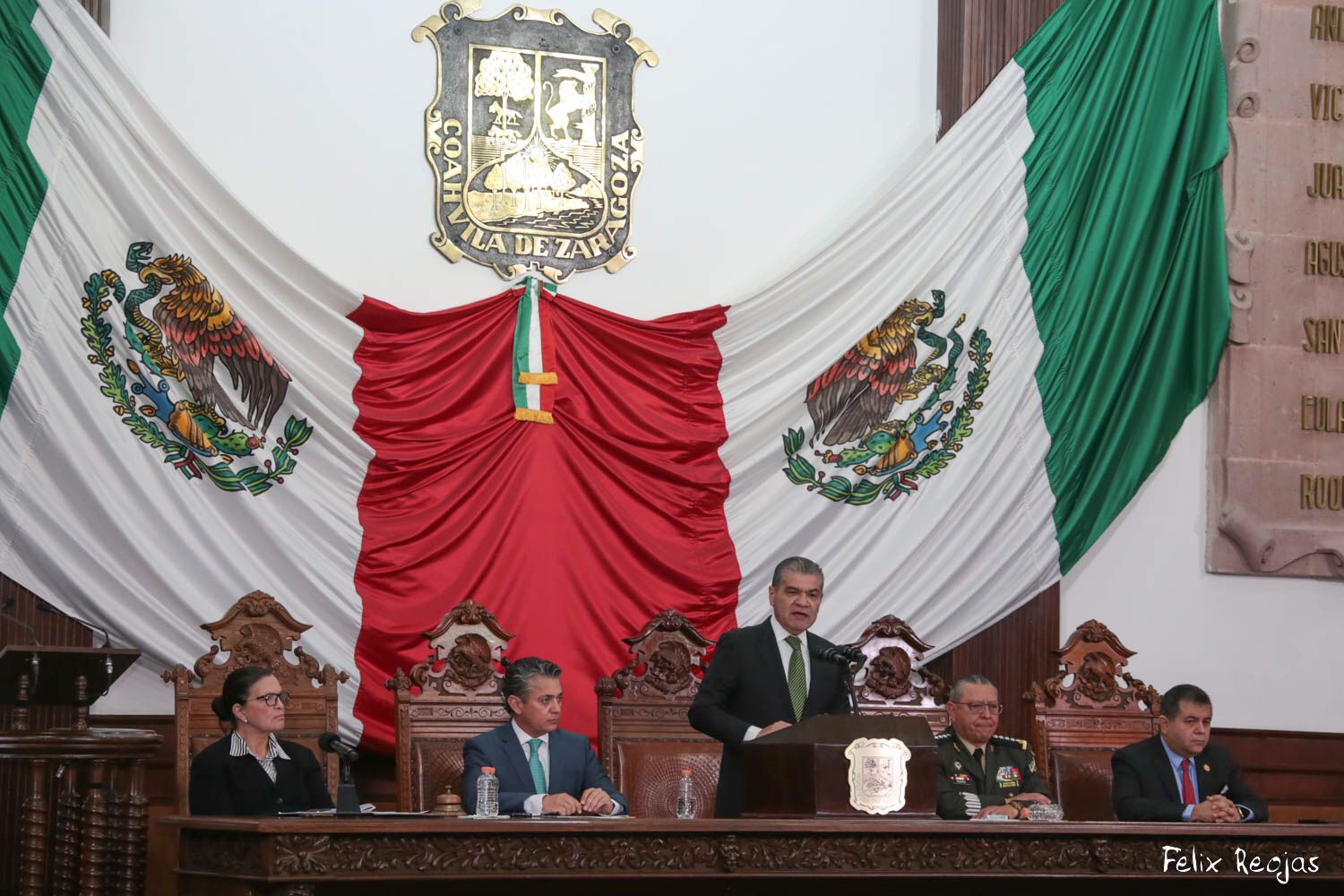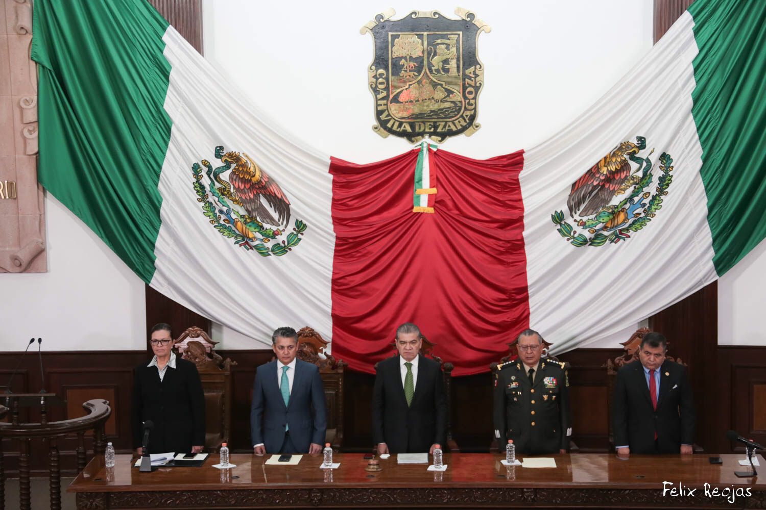 Esta sesión, donde también se rinde homenaje a Don Venustiano Carranza y a los diputados del Vigésimo Segundo Congreso Constitucional del Estado, fue presidida por el gobernador del Estado, Miguel Ángel Riquelme Solís, el presidente de la Junta de Gobierno del Congreso local, diputado Eduardo Olmos Castro, el presidente del Tribunal Superior de Justicia, magistrado Miguel Felipe Mery Ayup, el General de División Diplomado de Estado Mayor, Eufemio Alberto Ibarra Flores, comandante de la XI Región Militar, así como la presidenta de la Mesa Directiva del Congreso, diputada Luz Natalia Virgil Orona.