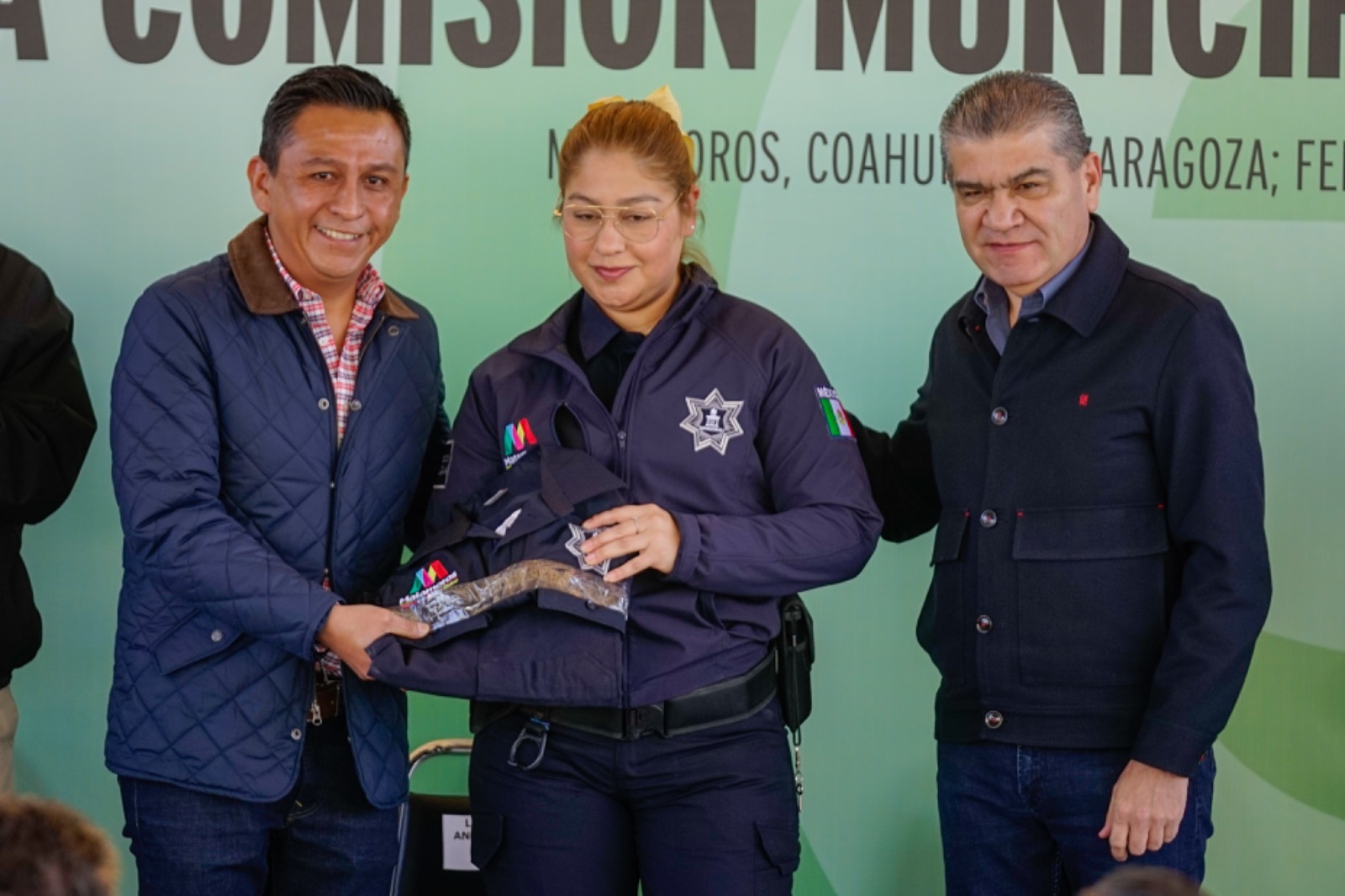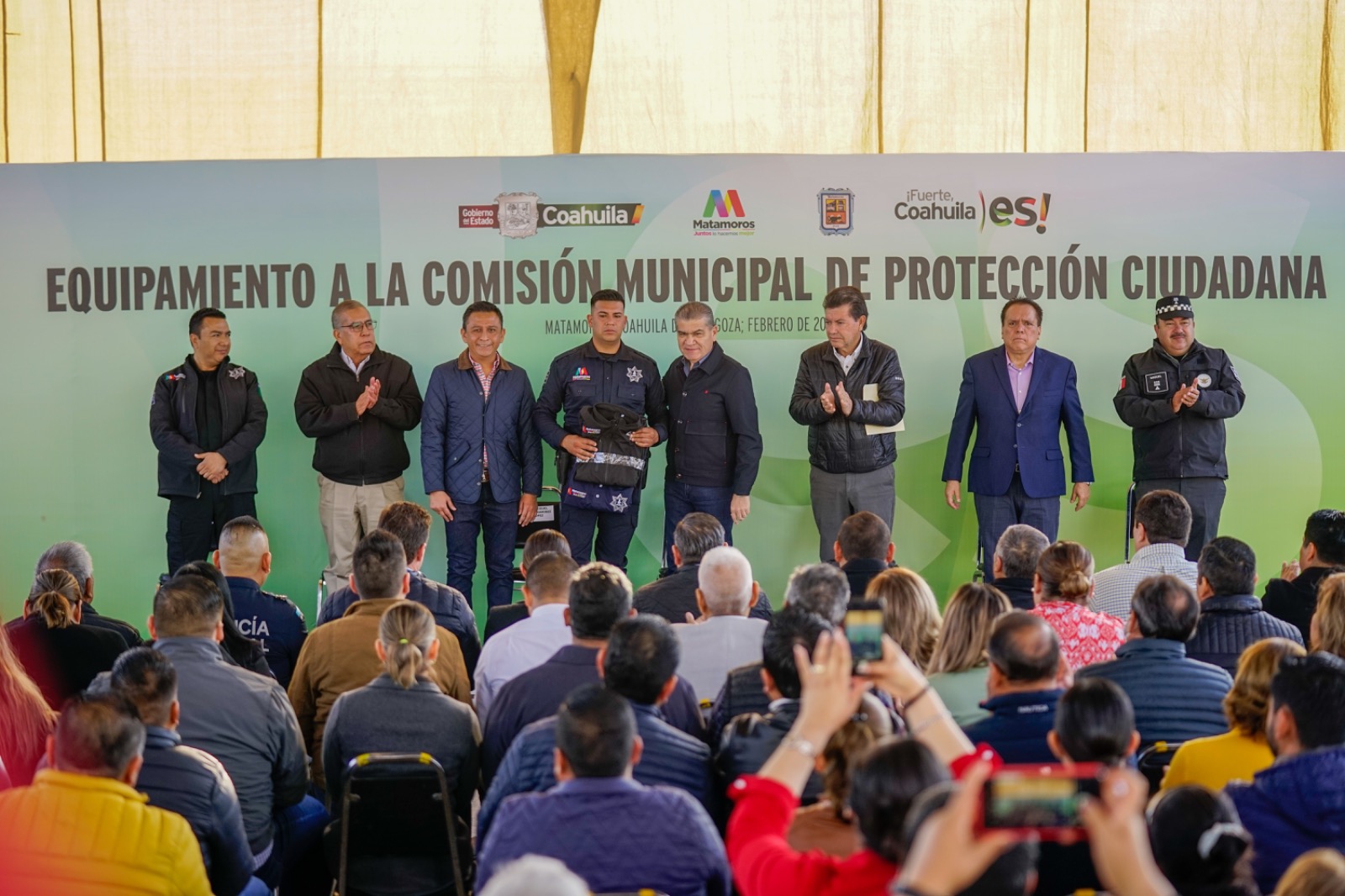 Matamoros, Coahuila de Zaragoza.- El gobernador Miguel Ángel Riquelme Solís entregó equipamiento a elementos de la Policía de Protección Ciudadana de esta ciudad, en lo que se invirtieron más de 2 millones de pesos.