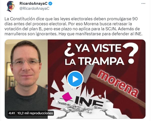 Ciudad de México.- Ricardo Anaya pidió a la ciudadanía, a través de un video difundido en sus redes sociales, defender al Instituto Nacional Electoral (INE) en una manifestación masiva contra la iniciativa de Reforma Electoral promovida por Morena y conocida como Plan B.