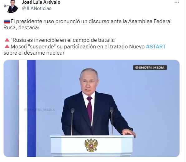 🔺Moscú «suspende» su participación en el tratado Nuevo #START sobre el desarme nuclear pic.twitter.com/fiVETF5r08— José Luis Arévalo (@JLANoticias) February 21, 2023