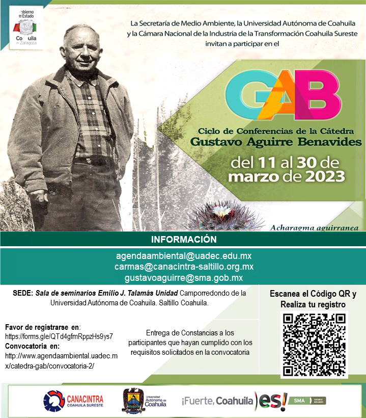 La Universidad Autónoma de Coahuila a través de la Coordinación de Agenda Ambiental Universitaria, la Secretaría del Medio Ambiente y la Cámara Nacional de la Industria de la Transformación (CANACINTRA) Región Sureste, invitan a participar de manera presencial en el Ciclo de Conferencias “Biodiversidad” de la Cátedra Gustavo Aguirre Benavides 2023 del 11 al 30 de marzo