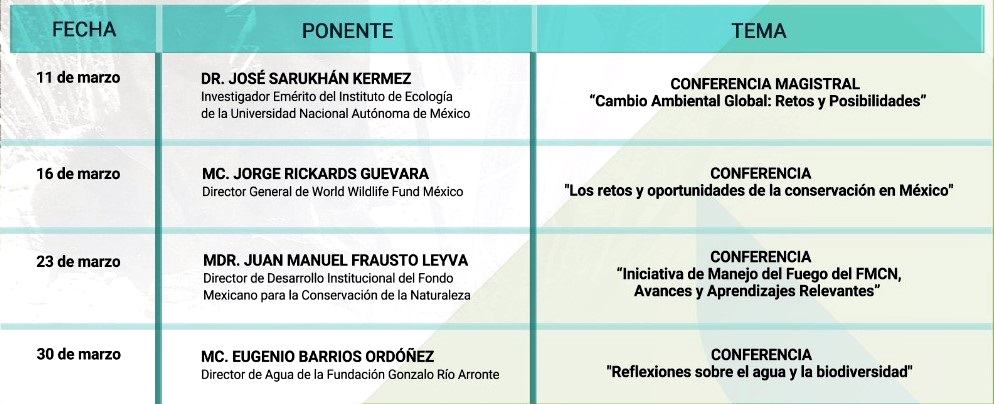 El jueves 16 de marzo de 17:00 a 19:00 horas la charla “Los retos y oportunidades de la conservación en México”, a cargo de MC. Jorge Rickards Guevara, director general de World Wildlife Fund México; el 23 de marzo de 17:00 a 19:00 “Iniciativa de Manejo del Fuego del FMCN, Avances y Aprendizajes Relevantes”, por el MDR. Juan Manuel Frausto Leyva, director del Desarrollo Institucional del Fondo Mexicano para la Conservación de la Naturaleza.