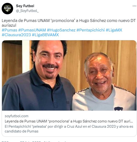“A mí no me gusta repetir, pero estaría bien, creo que Hugo Sánchez es un técnico de casa, un técnico que podría ayudar y no estaría mal, no lo vería mal y en caso de seguir de los malos resultados, pues si no estaría mal que Hugo Sánchez regresara, que estuviera, porque es una gente que, si siente los colores de Pumas, no digo que Rafa no los sienta, pero Hugo es otra cosa” mencionó en entrevista Negrete para el diario deportivo especializado en fútbol AS.