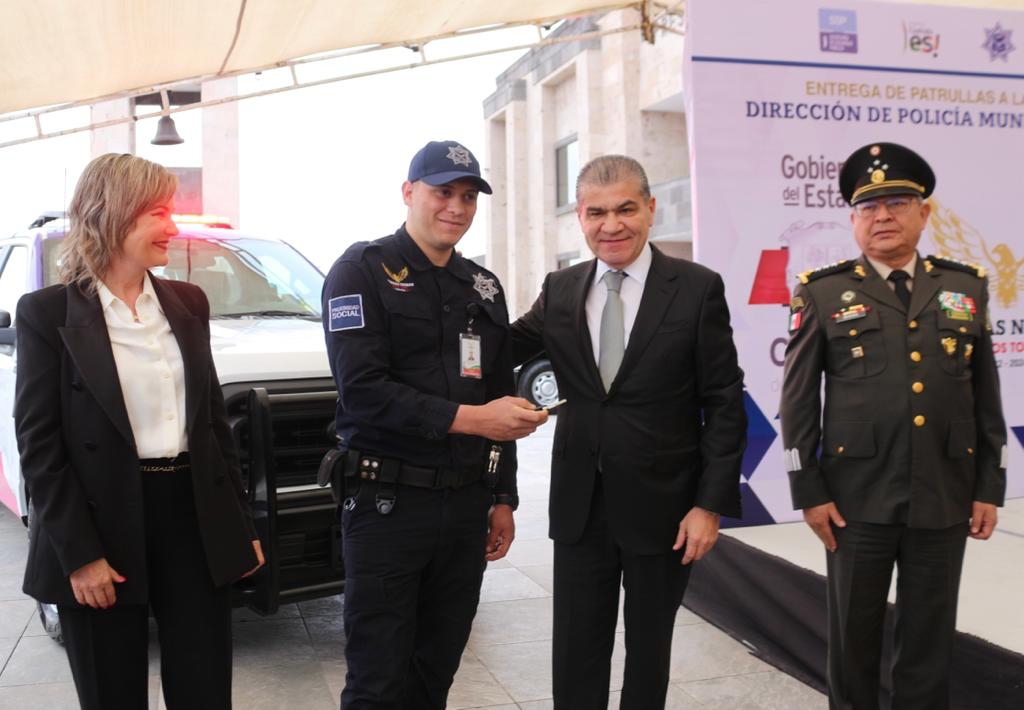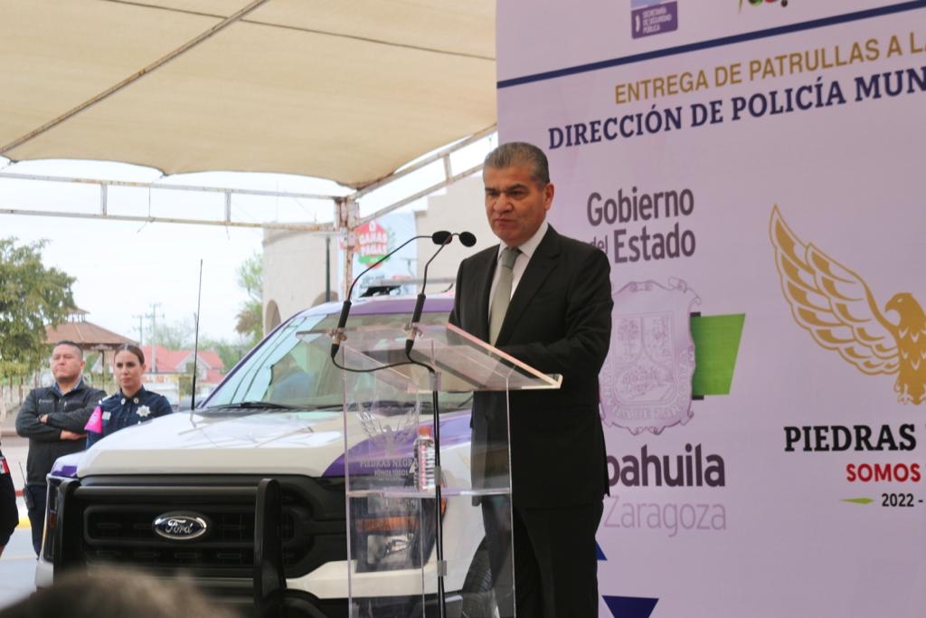 Piedras Negras, Coahuila.- Al resaltar que la seguridad que prevalece en la entidad es resultado de la coordinación de esfuerzos, el gobernador Miguel Ángel Riquelme Solís entregó patrullas a la Dirección de Seguridad Pública Municipal, con inversión de 4.5 millones de pesos.