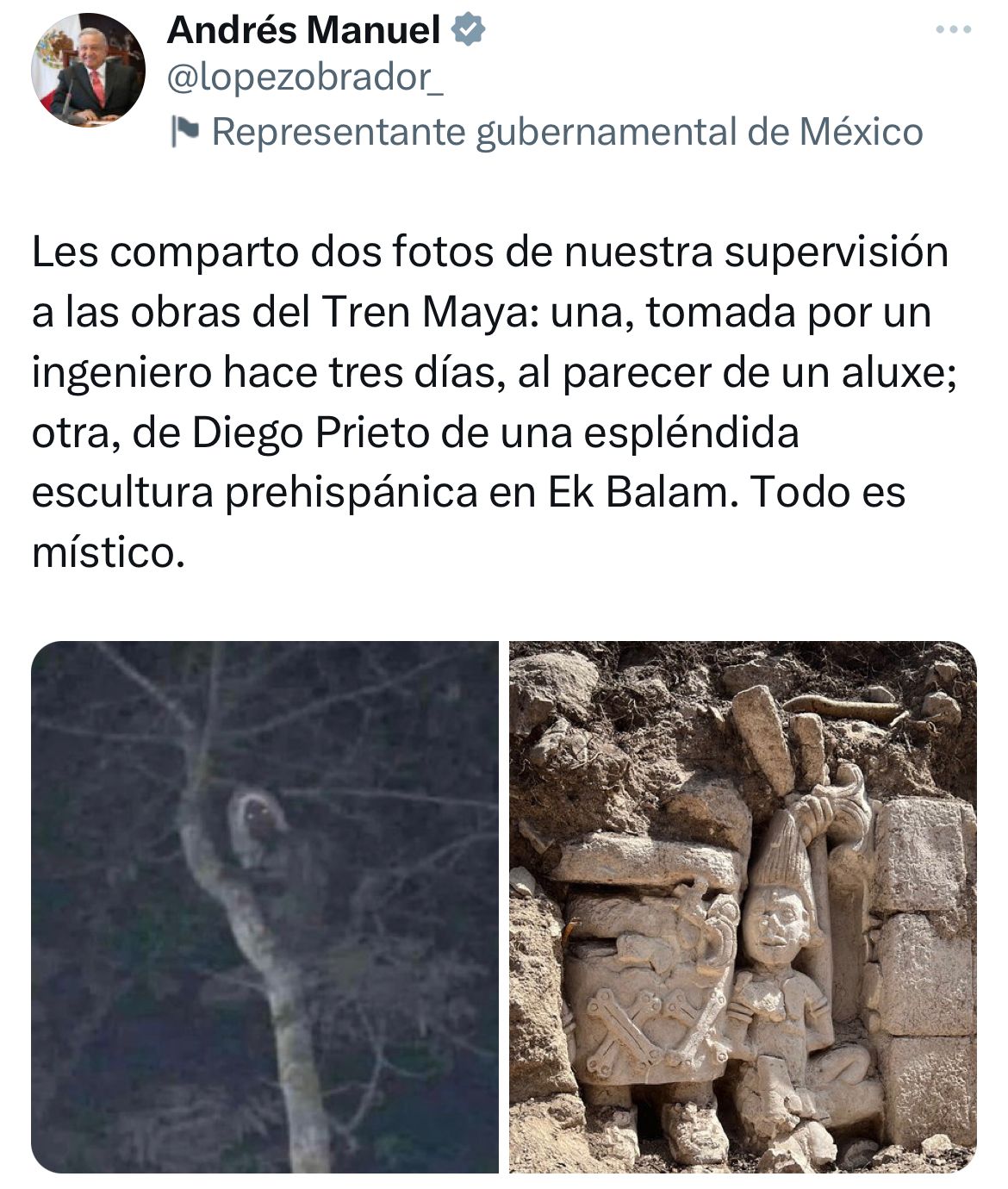 “Les comparto dos fotos de nuestra supervisión a las obras del Tren Maya: una, tomada por un ingeniero hace tres días, al parecer de un aluxe; otra, de Diego Prieto de una espléndida escultura prehispánica en Ek Balam. Todo es místico”, escribió.