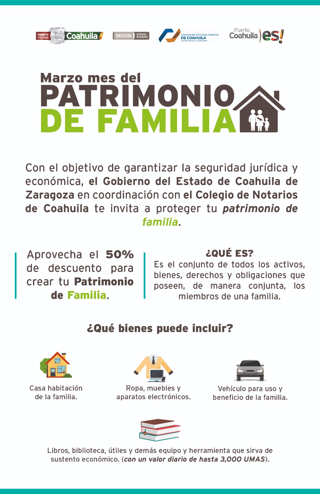 Para brindarles seguridad jurídica y económica sobre sus bienes, el Gobierno de Coahuila y el Colegio de Notarios de Coahuila habilitarán durante todo el mes de marzo de este 2023 una campaña para que los coahuilenses puedan registrar legalmente su Patrimonio de Familia.