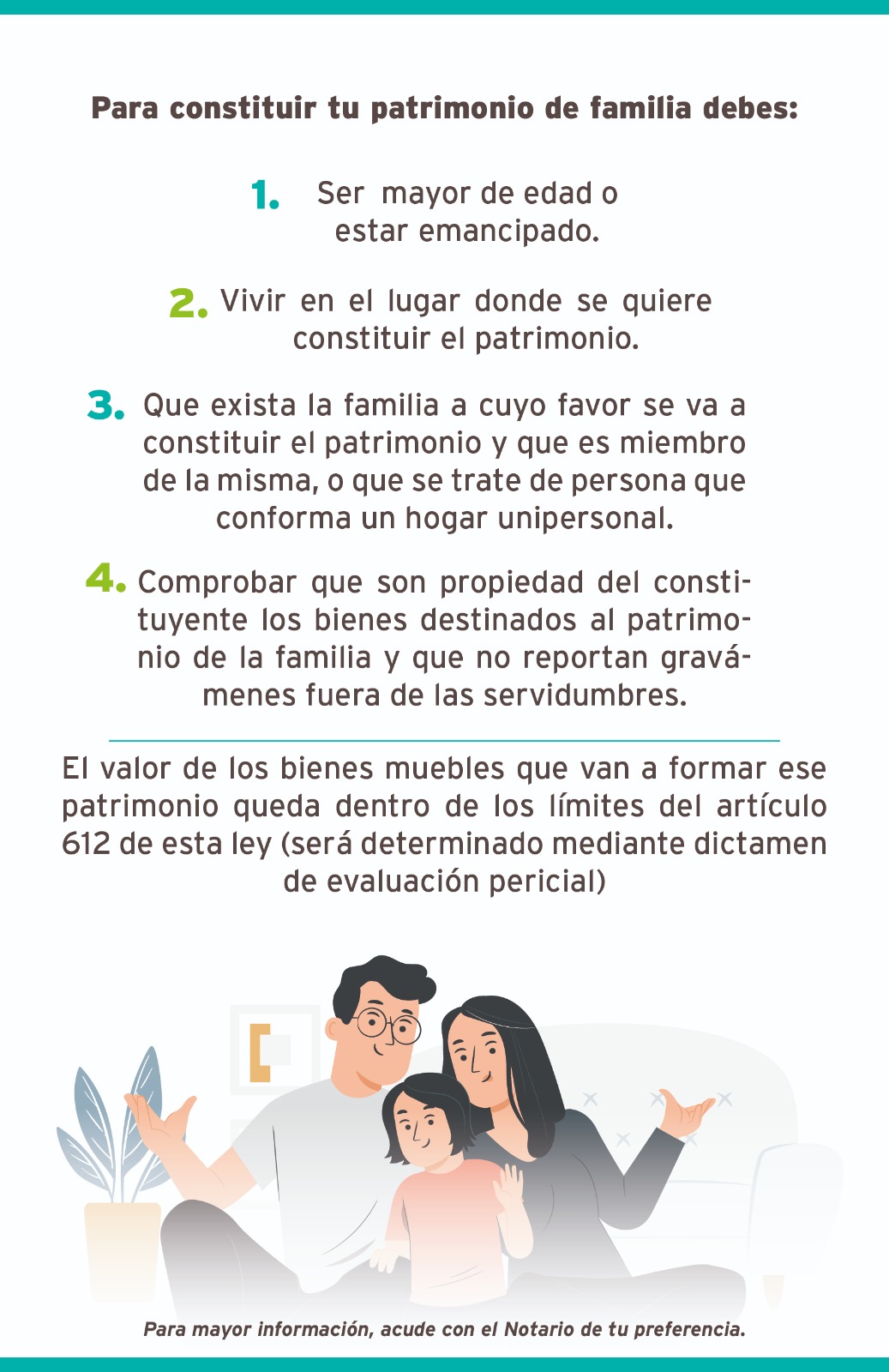 «Creemos que un buen elemento es constituir un Patriomonio de Familia. Lo que tienen que hacer es acudir al notario para asesorarse, para plantear situaciones concretas sobre qué quieren proteger. El notario hace un acta pública y se lleva a inscribir al Registro Público de la Propiedad. Estamos apoyando con un descuento del 50 por ciento en los honorarios para cubrir este proceso, cuyo precio cambia por los bienes que están sujetos al proceso», ahondó.