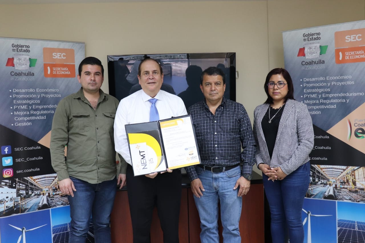 Es por ello que el Gobierno de Coahuila, a través de su SEC y la casa certificadora Nemt Register, entregaron dicho certificado a la empresa Ténder Eléctrica, que se dedica al estampado de chapa de acero, aplicación de fosfato y pintura, horneado de piezas y procesos de soldadura, para la industria en general.