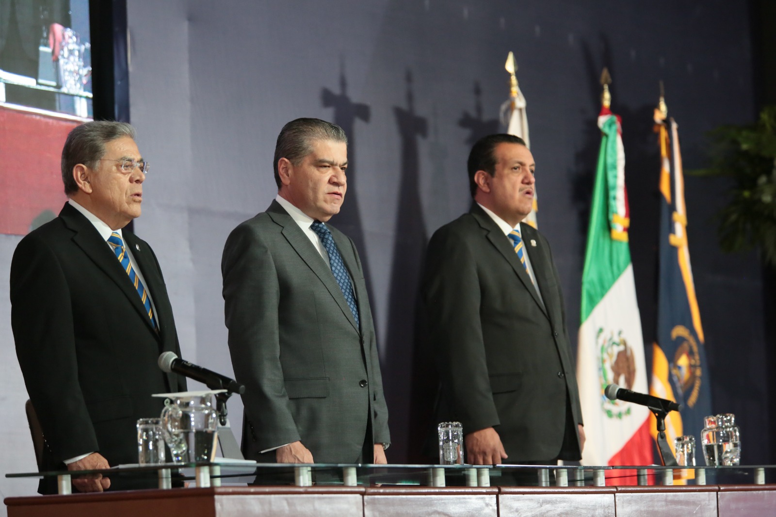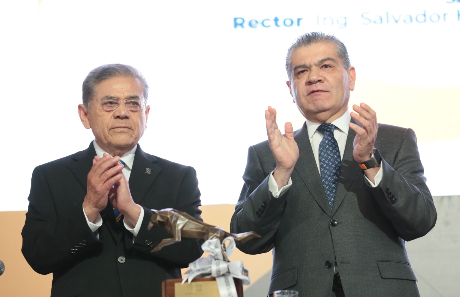 Miguel Riquelme destacó que la Autónoma de Coahuila ha sido componente central del círculo virtuoso que se sostiene entre los pilares del desarrollo y crecimiento: Seguridad pública, educación de calidad, inversiones productivas, empleos formales, bienestar y seguridad social para las familias.