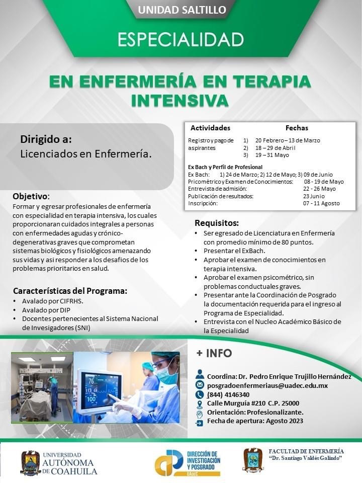 La Universidad Autónoma de Coahuila a través de la Facultad de Enfermería “Dr. Santiago Valdés Galindo” Unidad Saltillo, ofrece la Especialidad en Enfermería en Terapia Intensiva, la cual está dirigida a Licenciados en Enfermería y cuyas clases iniciarán en agosto 2023, los interesados registrarse en www.uadec.mx/admisiones
