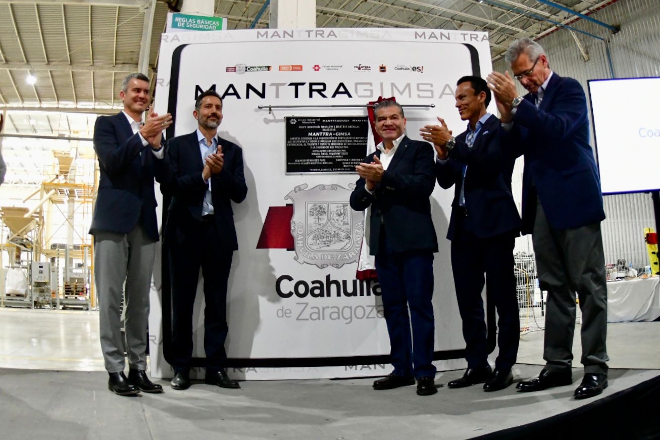 Frontera, Coahuila de Zaragoza.- Con una inversión inicial de 15 millones de dólares, Manttra-GIMSA fue inaugurada este jueves por el gobernador Miguel Ángel Riquelme Solís, quien acompañó en esta ceremonia a Gerardo Benavides Pape, presidente del Consejo de Administración de Grupo Industrial Monclova; Édgar Hernández, presidente de la Junta Directiva de Grupo Manttra Américas, y Christian Kaehler, Fundador y Director de esta compañía.