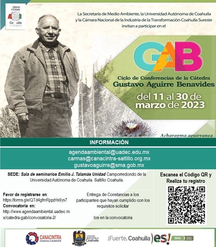 La Secretaría de Medio Ambiente del Estado (SMA), la Universidad Autónoma de Coahuila y CANACINTRA Sureste, realizarán la XI Edición de la Cátedra “Gustavo Aguirre Benavides 2023”, entre el 11 y el 30 de marzo, que se desarrollará con el tema “Biodiversidad”.