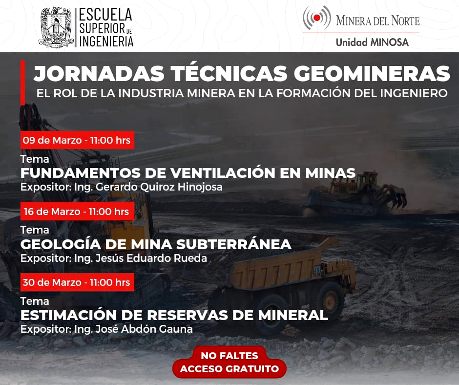 Las actividades iniciarán de manera presencial el día jueves 9 de marzo con la conferencia “Fundamentos de ventilación en Minas”, a cargo del Ing. Gerardo Quiroz Hinojosa; el 16 de marzo con “Geología de Mina Subterránea”, a cargo del Ing. Jesús Eduardo Rueda y el 30 de marzo con “Estimación de reservas de Mineral”, a cargo del Ing. José Abdón Gauna.
