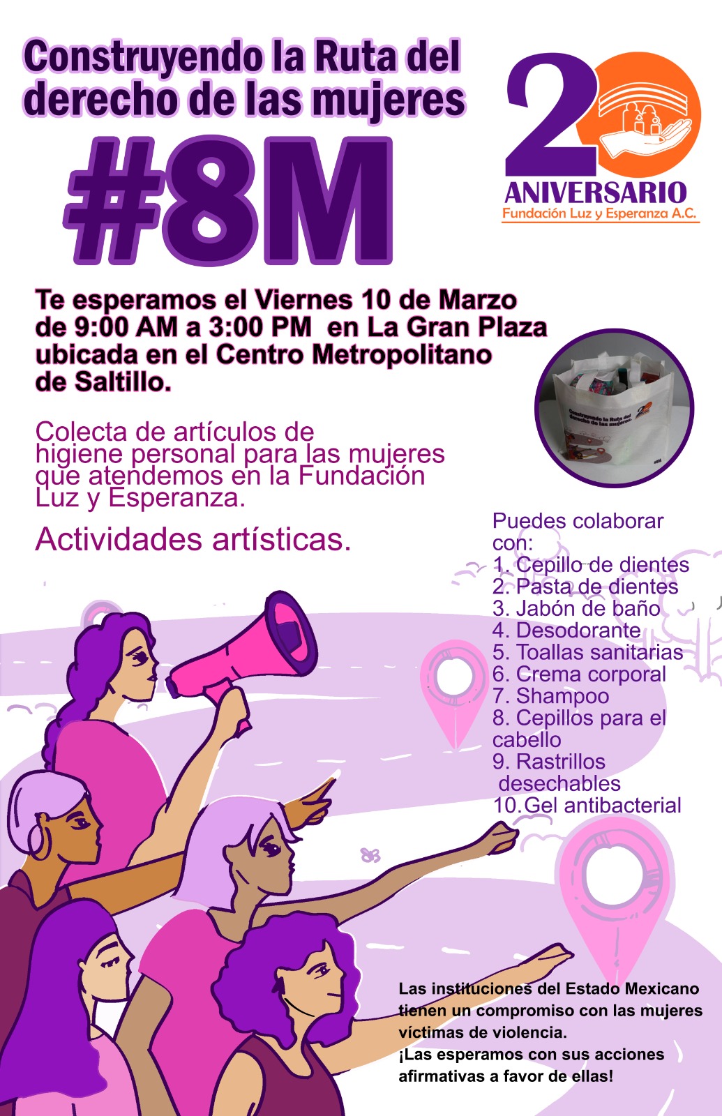 La presidente de la Fundación Luz y Esperanza AC, Rosa María Salazar Rivera dio a conocer que este viernes 10 de marzo se llevará a cabo en la Gran Plaza del Centro Metropolitano la colecta denominada “Construyendo la Ruta del Derecho de las Mujeres”, a través de la cual se estarán recibiendo donativos consistentes en artículos de higiene personal para las mujeres que son atendidas en el Centro de Atención Externa de esa institución.