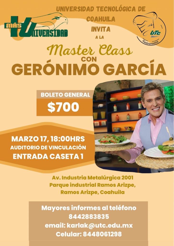 La Universidad Tecnológica de Coahuila (UTC) convoca a la ciudadanía en general, así como a estudiantes de carreras afines a gastronomía, a participar en la primer Master Class de Gastronomía dirigida por el chef Gerónimo García Villareal, profesional de la cocina por más de 17 años.