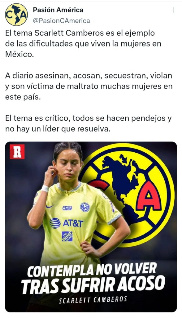 La mediocampista de origen estadounidense se encuentra fuera de México debido al acoso que sufrió. Y es que la jugadora, temía por su integridad. No obstante, el Club América femenil tiene confianza en que con esta medida de la Fiscalía de la CDMX Scarlett Camberos regrese al Nido de Coapa.