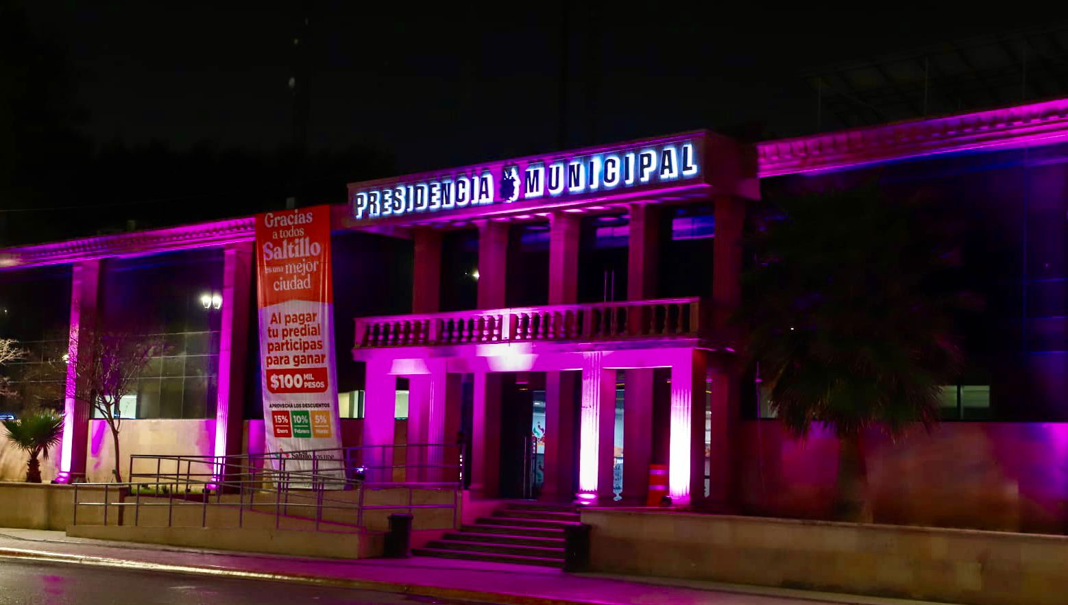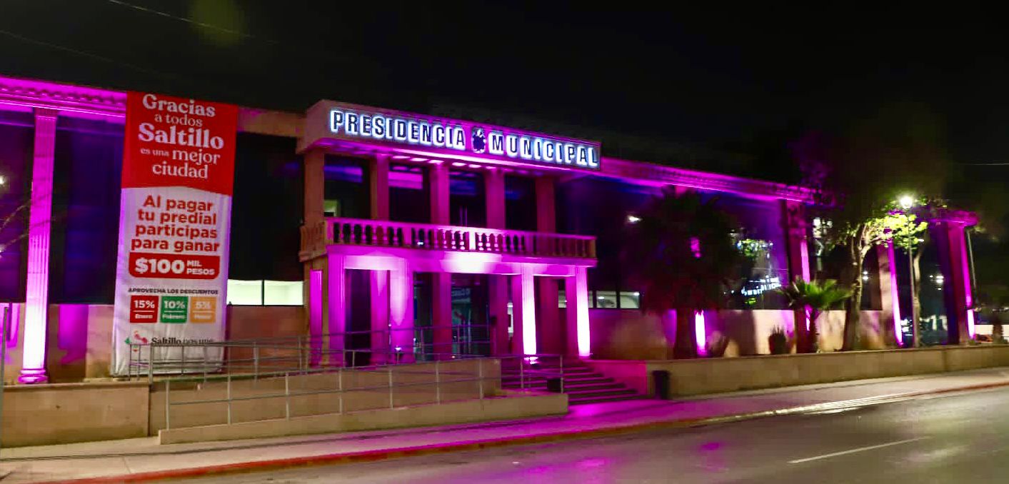 En conmemoración por el Día Internacional de la Mujer, la Presidencia Municipal de Saltillo se iluminó de morado como símbolo de apoyo a la lucha diaria para dar a las mujeres las condiciones necesarias para su desarrollo.