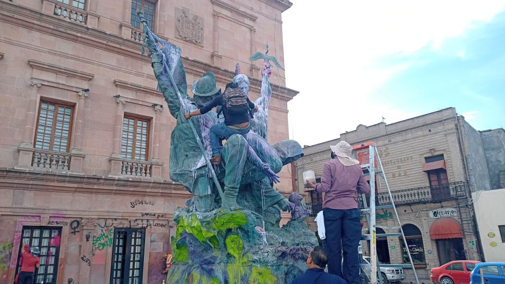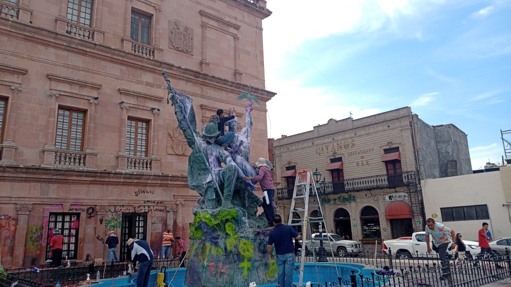A su vez, personal de Conservación del Centro Histórico realizó las labores de limpieza a la escultura que se ubica en la fuente de la Plaza, misma que presentó manchas de pintura en su constitución general.