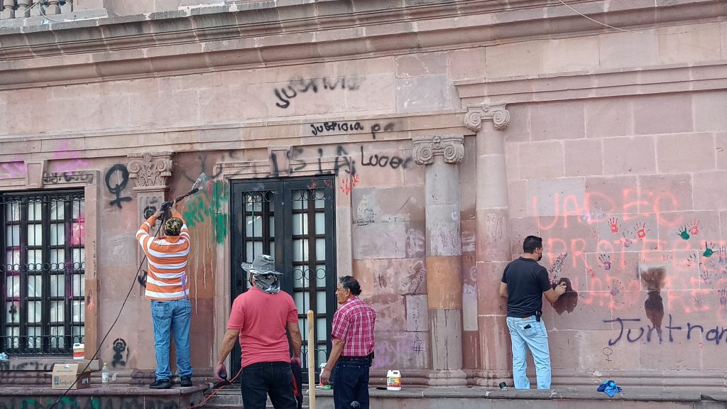 Espacios al exterior del Palacio de Gobierno también sufrieron pintas con mensajes alusivos a la lucha feminista, por lo que fueron limpiados con un líquido especial para evitar corrosión y daños permanentes a la cantera rosa de sus muros.