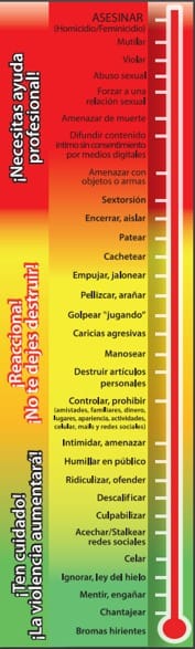 Para ello también fue necesario exponer el violentómetro, el cual permite medir las diversas manifestaciones de la violencia. Se divide en tres escalas, que contemplan desde bromas hirientes, mentiras, celos, humillaciones, amenazas, prohibiciones, pellizcos y extorsión, hasta abuso sexual, violación, mutilación e incluso hasta la muerte. (EL HERALDO)