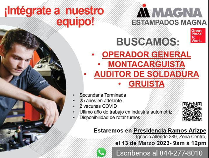 El próximo lunes 13 de marzo, personal de Recursos Humanos de Magna Estampados estará en la Presidencia Municipal de Ramos Arizpe en una jornada para el reclutamiento de operarios generales, montacarguistas, auditores de soldadura y gruistas.