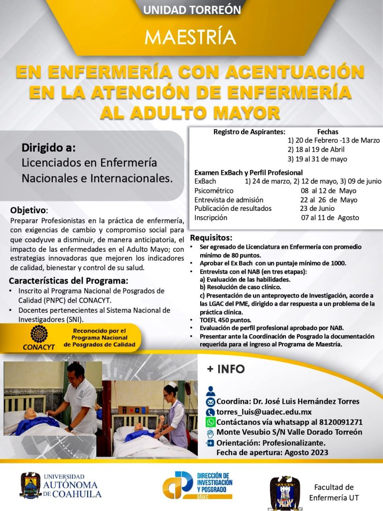 Torreón, Coahuila.- La Universidad Autónoma de Coahuila a través de la Facultad de Enfermería Unidad Torreón ofrece la Maestría en Enfermería con Acentuación en Atención de Enfermería al Adulto Mayor, la cual está dirigida a Licenciados en Enfermería nacionales e internacionales y cuyas clases iniciarán en agosto 2023; las personas interesadas deberán registrarse en www.uadec.mx/admisiones.