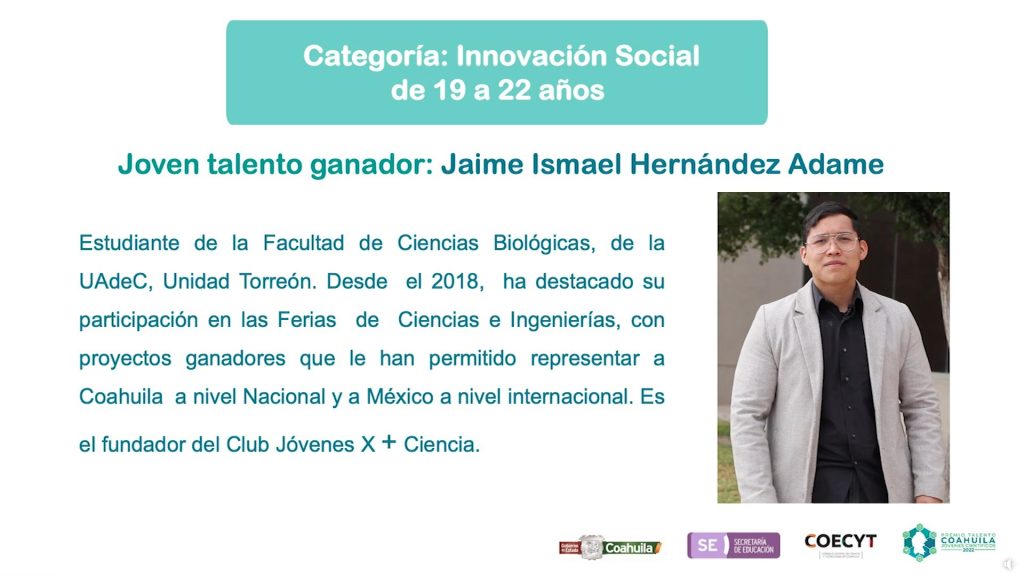 En la categoría de Innovación Social, del grupo de 19 a 22 años, resultó galardonado Jaime Ismael Hernández Adame, estudiante de la Facultad de Ciencias Biológicas de la Unidad Torreón, por su trayectoria y destacada participación desde el 2018 en las Ferias de Ciencias e Ingenierías, con proyectos ganadores que le han permitido representar a Coahuila a nivel Nacional y a México a nivel internacional, así como por ser el fundador del Club “Jóvenes x más Ciencia”.