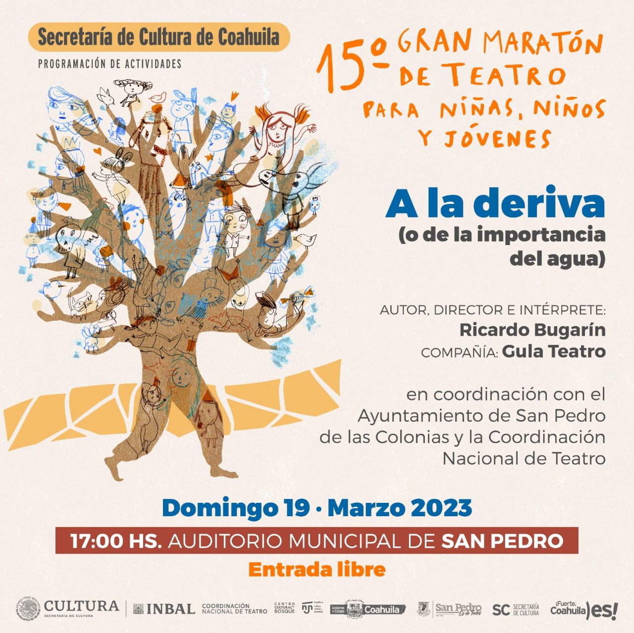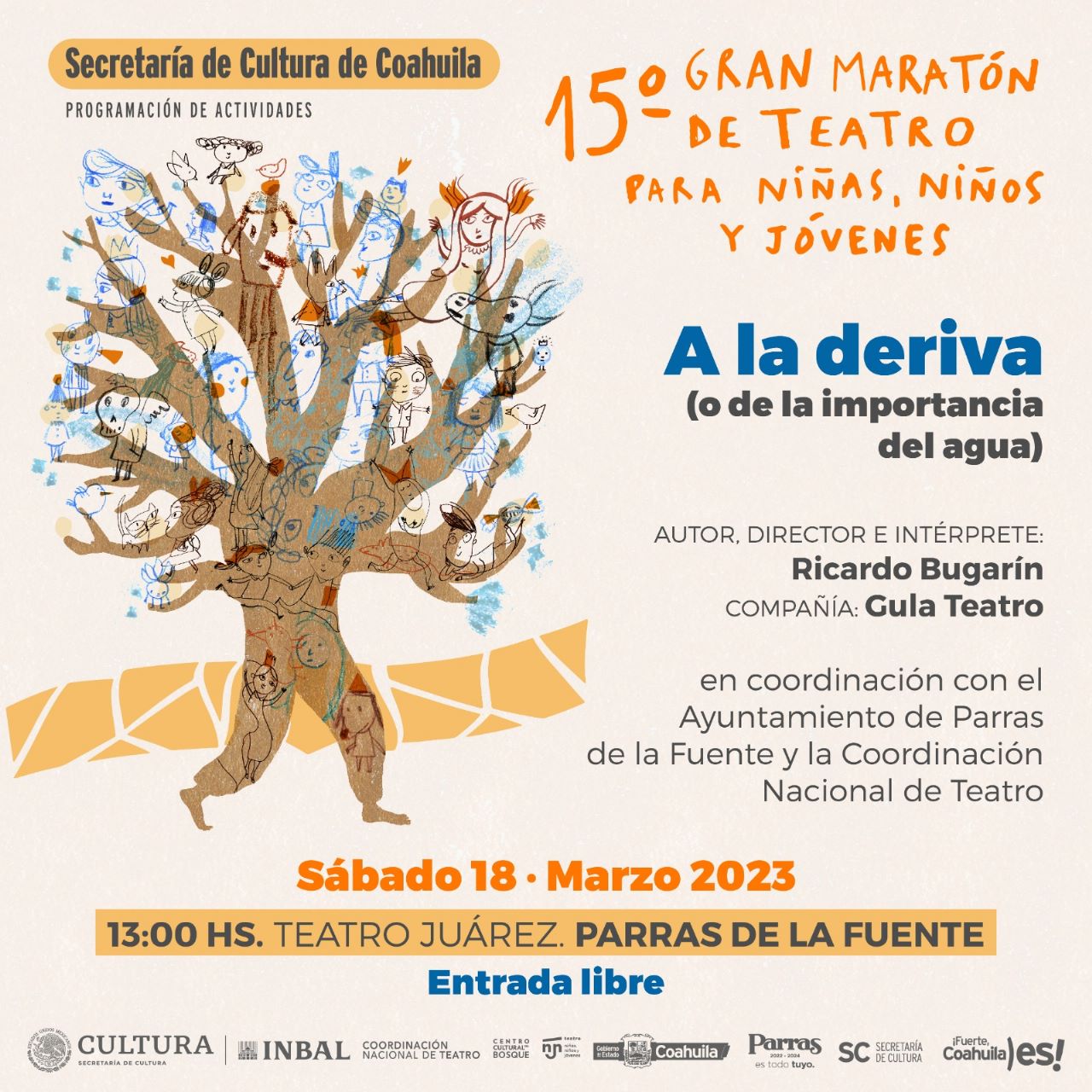 Como parte de las acciones de trabajo conjunto con diversas instancias, la Secretaría de Cultura de Coahuila (SC) y su Coordinación Nacional de Teatro, presentan los días 18 y 19 de marzo el 15º Gran Maratón de Teatro para Niñas, Niños y Jóvenes.