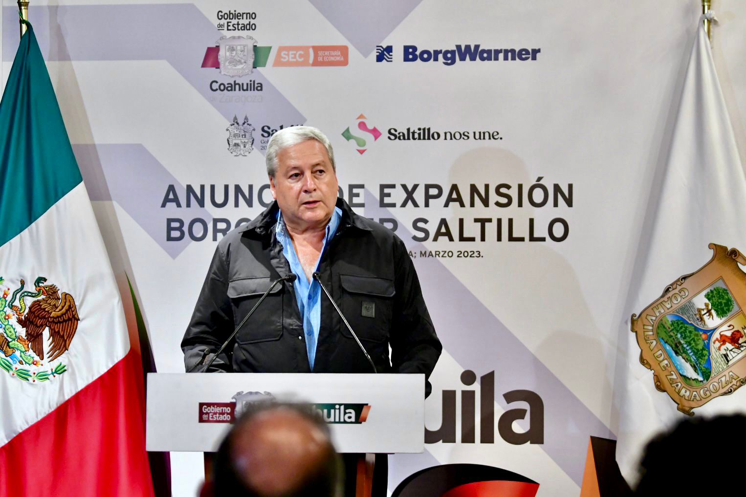 El alcalde José María Fraustro Siller acompañó al gobernador Miguel Ángel Riquelme Solís al anuncio de expansión de la empresa BorgWarner Saltillo, la cual hará una inversión de 47 millones de dólares y generará 450 nuevos empleos en la localidad.