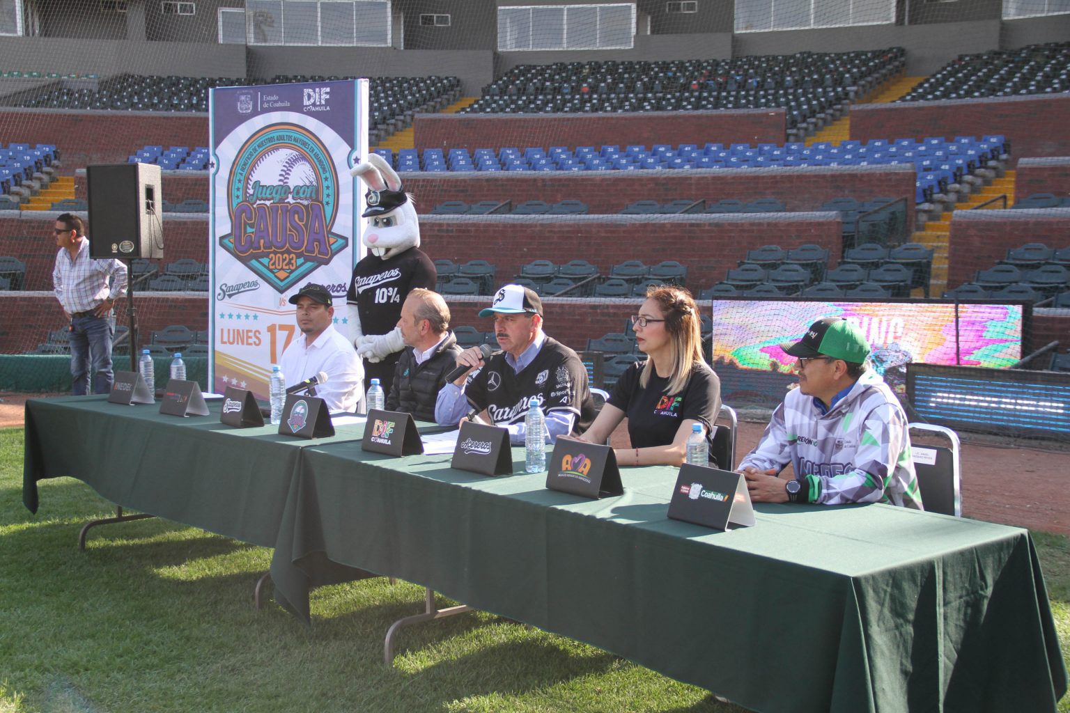 En el anuncio del encuentro estuvieron presentes, Rodrigo Aguirre, Director Deportivo de los Saraperos; Ángel Vázquez Reyes, en representación de la directora del INEDEC, Alina Garza Herrera y Mayra Guillen Charles, directora de Inclusión Social y Familiar de DIF Coahuila. (FERNANDO VALDÉS)