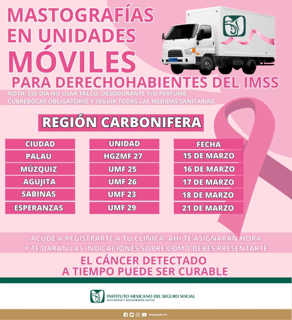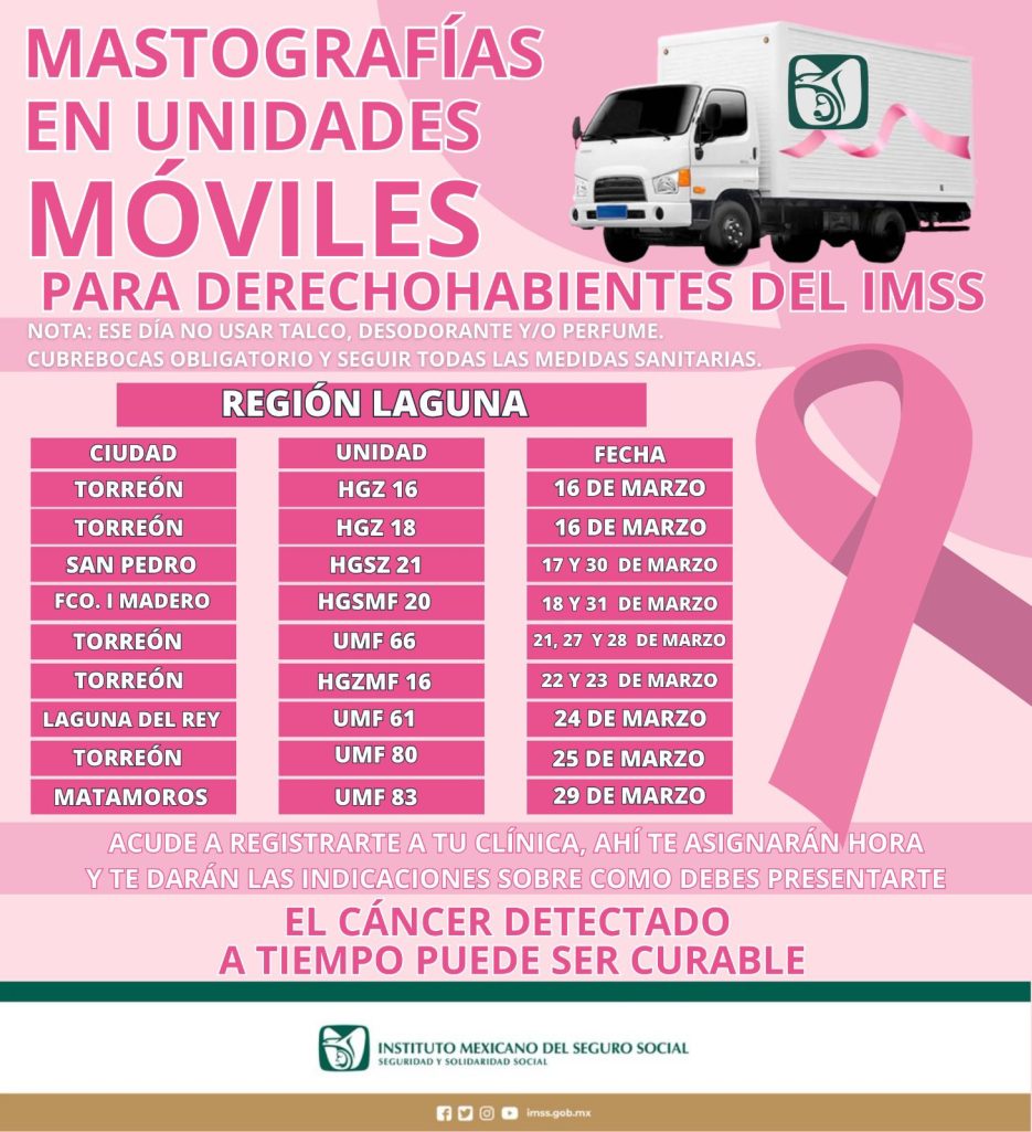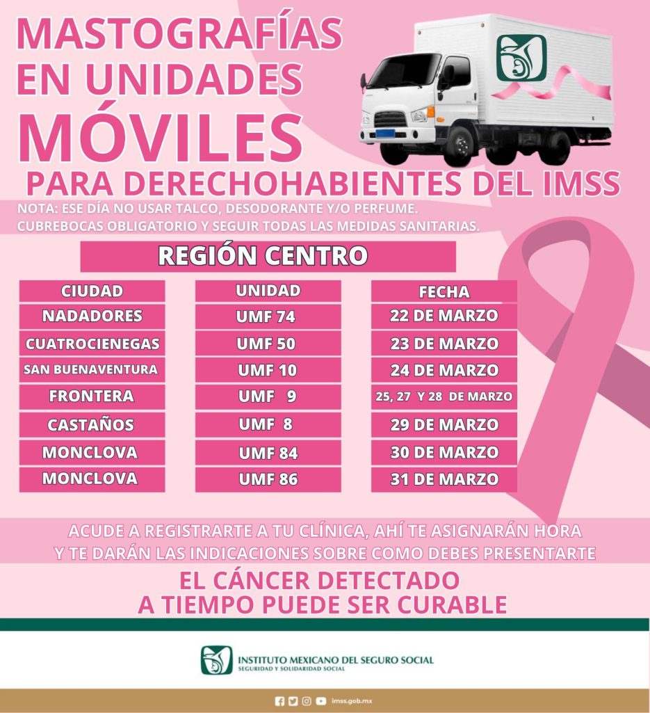 El Instituto Mexicano del Seguro Social (IMSS) Coahuila llamó a las mujeres mayores de 40 años a aprovechar la presencia de los mastógrafos móviles, que estarán del 16 al 31 de marzo en las diversas unidades médicas del estado.