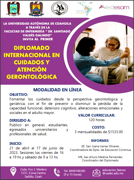 La Facultad de Enfermería “Dr. Santiago Valdés Galindo” de la Universidad Autónoma de Coahuila, en colaboración con la Red Latinoamericana de Cuidado al Paciente Crónico y la Familia (Red CRONIFAM) y la Red de Enfermería en Salud del Adulto Mayor (Red ESAM) invitan a cursar el Diplomado Internacional en Cuidados y Atención Gerontológica del 21 de abril al 17 de junio de 2023, en modalidad en línea a través de Microsoft Teams.